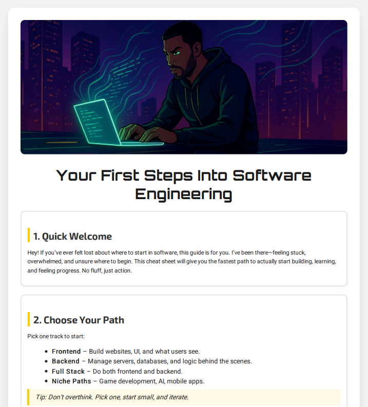 Get into software engineering fast with this short, beginner cheat sheet—made to actually help you start coding and building real projects, not just reading. You'll get the essentials, step-by-step tips, and real industry insights—all in a compact guide designed to launch you into tech, even if you’re starting from zero. Download, use, and start your journey today!